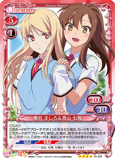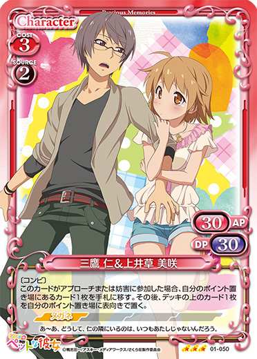 | 〔コンビ〕このカードがアプローチでポイントを与えた場合、カードを1枚引く。このカードがアプローチに参加した場合、相手のキャラ2枚を指定する。このターン、このカードは、指定したキャラには妨害されない。 | ||