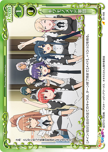 | [メイン/自分]:自分の全てのキャラは、ターン終了時まで【メイド】、+10/±0を得る。 | ||