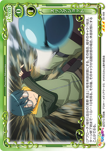 | [アプローチ/相手]:自分の「森野 亮士」1枚を休息状態にする。その場合、相手のキャラ1枚は、ターン終了時まで-10/-10を得る。その後、そのキャラが活動状態の場合、休息状態にすることができる。 | ||