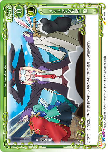 | [アプローチ/両方]:【メイド】を持つキャラ1枚のAP/DPの値を、元の値に戻す。 | ||