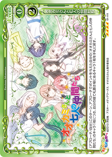 | [アプローチ/自分]:このターン、アプローチでポイントを与えた自分の『オオカミさんと七人の仲間たち』のキャラ1枚につき、自分の捨て札置き場にあるキャラ1枚を手札に戻す。 | ||