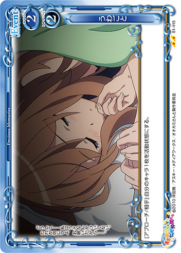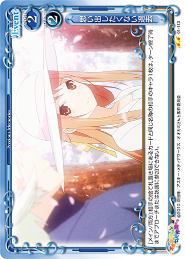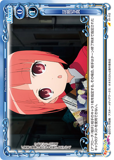 | [メイン/両方]:相手の捨て札置き場にあるカードと同じ名称の相手のキャラ1枚は、ターン終了時までアプローチまたは妨害に参加できない。 | ||
