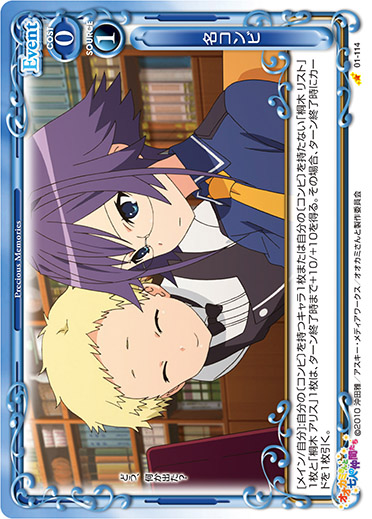 | [メイン/自分]:自分の〔コンビ〕を持つキャラ1枚または、自分の〔コンビ〕を持たない「桐木 リスト」1枚と「桐木 アリス」1枚は、ターン終了時まで+10/+10を得る。その場合、ターン終了時にカードを1枚引く。 | ||