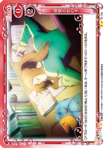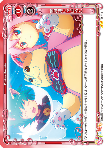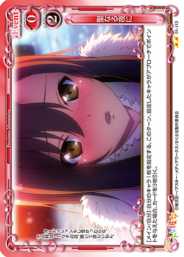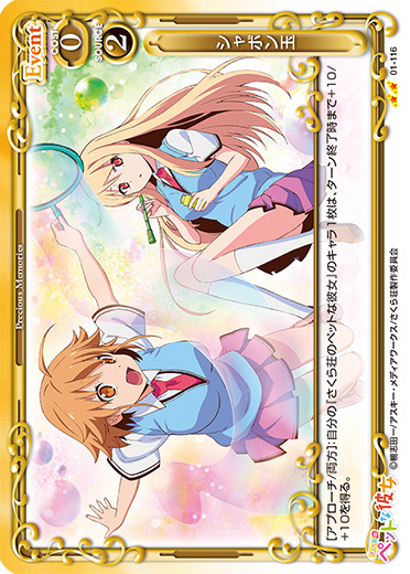 | [アプローチ/両方]:自分の『さくら荘のペットな彼女』のキャラ1枚は、ターン終了時まで+10/+10を得る。 | ||