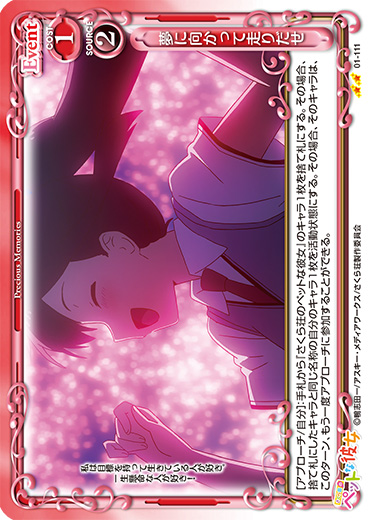 | [メイン/自分]:自分のキャラ1枚を指定する。このターン、指定したキャラがアプローチでポイントを与えた場合、カードを3枚引く。 | ||