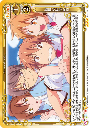 | [メイン/自分]:デッキの上のカード5枚を見て、その中にある同じ名称の『さくら荘のペットな彼女』のキャラ2枚を抜き出し、表にしてから手札に加える。その後、残りのカードを任意の順番でデッキの下に移す。 | ||