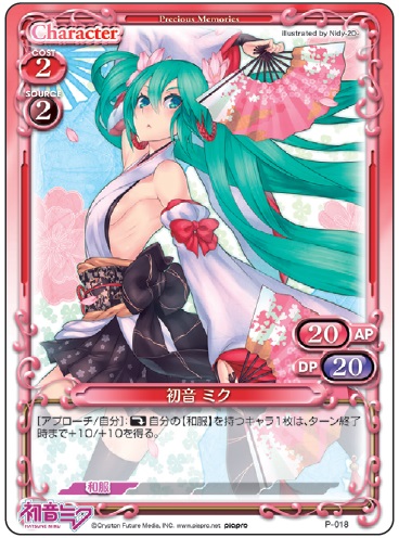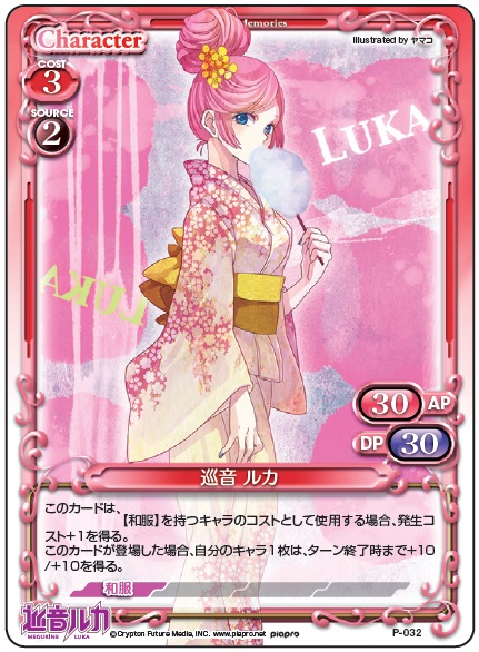 | このカードは、【和服】を持つキャラのコストとして使用する場合、発生コスト+1を得る。 このカードが登場した場合、自分のキャラ1枚は、ターン終了時まで+10/+10を得る。 | ||