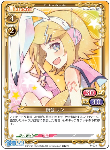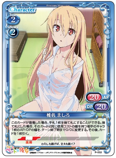 | このカードが登場した場合、手札1枚を捨て札にすることができる。捨て札にした場合、そのカードと同じ使用コストの値を持つ相手のキャラ1枚のAP/DPの値を、ターン終了時まで0/0に変更する。その後、カードを1枚引く。 | ||
