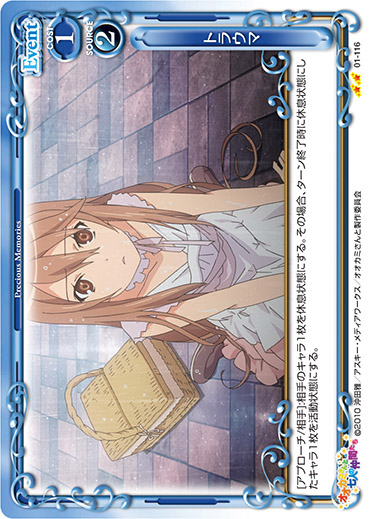 | [アプローチ/相手]:相手のキャラ1枚を休息状態にする。その場合、ターン終了時に休息状態にしたキャラ1枚を活動状態にする。 | ||