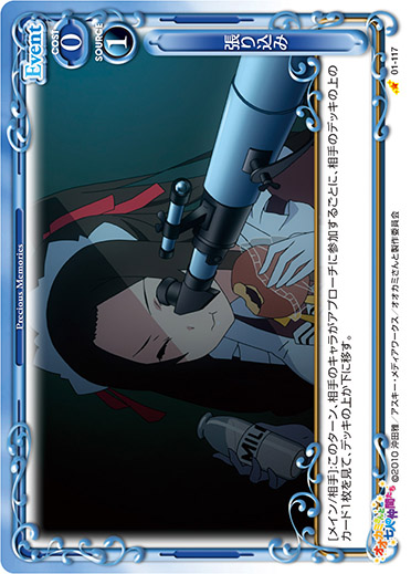 | [メイン/相手]:このターン、相手のキャラがアプローチに参加するごとに、相手のデッキの上のカード1枚を見て、デッキの上か下に移す。 | ||