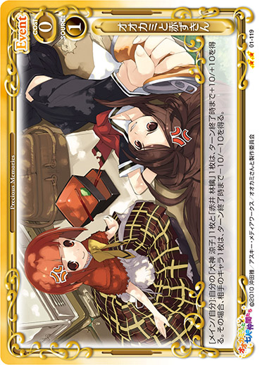 | [メイン/自分]:自分の「大神 涼子」1枚と「赤井 林檎」1枚は、ターン終了時まで+10/+10を得る。その場合、相手のキャラ1枚は、ターン終了時まで-10/-10を得る。 | ||
