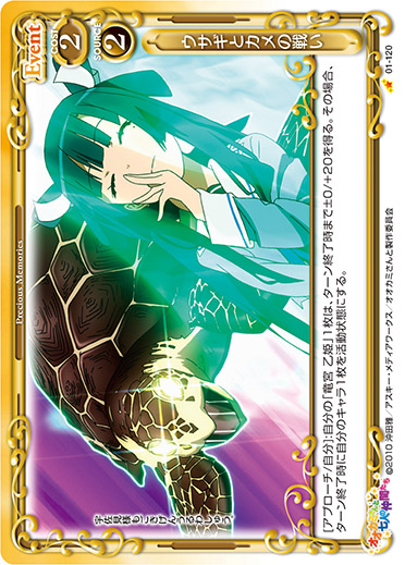 | [アプローチ/自分]:自分の「竜宮 乙姫」1枚は、ターン終了時まで±0/+20を得る。その場合、ターン終了時に自分のキャラ1枚を活動状態にする。 | ||