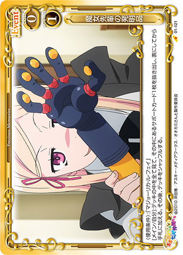 | 《使用条件》:「マジョーリカ・ル・フェイ」 [メイン/自分]:デッキの中を全て見て、その中にあるサポートカード1枚を抜き出し、表にしてから手札に加える。その後、デッキをシャッフルする。 | ||