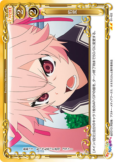 | [メイン/自分]:自分のキャラ1枚のAP/DPの値を、ターン終了時まで50/0に変更する。 | ||