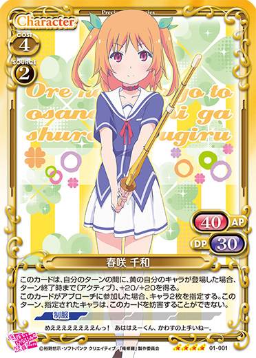 | このカードがアプローチに参加した場合、このカードと、このカード以外の黄の自分のキャラ1枚は、ターン終了時まで+20/+20を得る。 | ||