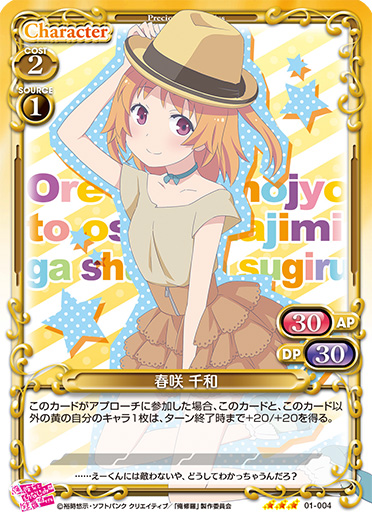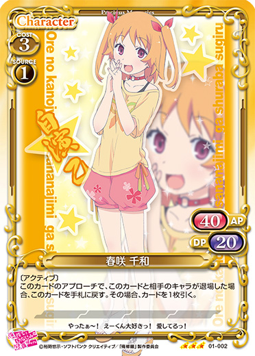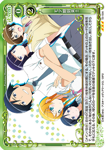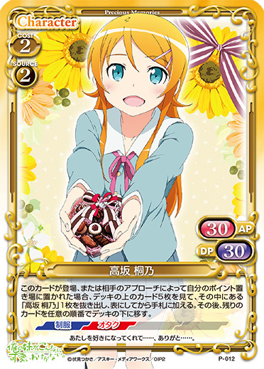 | [メイン/自分]:自分の「高坂 京介」1枚を休息状態にする。その場合、デッキの上のカード5枚を見て、その中にある『俺の妹がこんなに可愛いわけがない。』のカード1枚を抜き出し、表にしてから手札に加える。その後、残りのカードを任意の順番でデッキの下に移す。 | ||