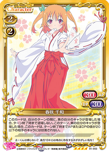 | このカードは、自分のターンの間に、黄の自分のキャラが登場した場合、ターン終了時まで退場しない。このターン、黄の自分のキャラが登場した場合、このカードは、ターン終了時までAPまたはDPの値が20以下の相手のキャラには妨害されない。 | ||