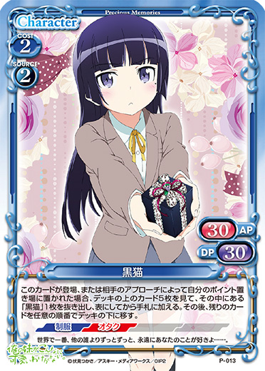 | このカードが登場、または相手のアプローチによって自分のポイント置き場に置かれた場合、デッキの上のカード5枚を見て、その中にある「高坂 桐乃」1枚を抜き出し、表にしてから手札に加える。その後、残りのカードを任意の順番でデッキの下に移す。 | ||