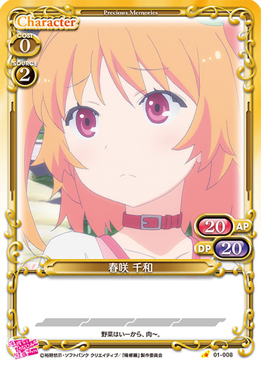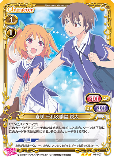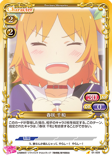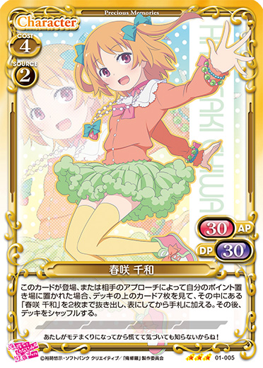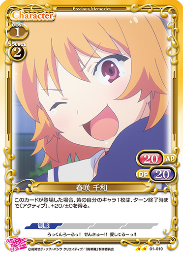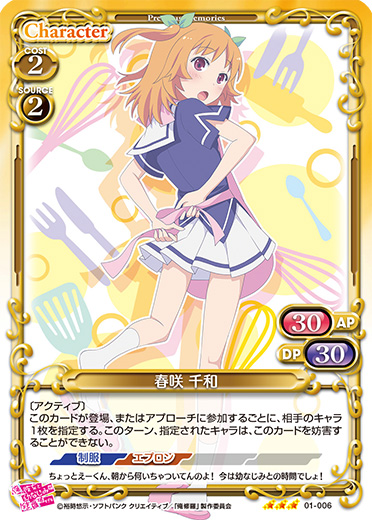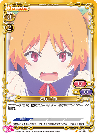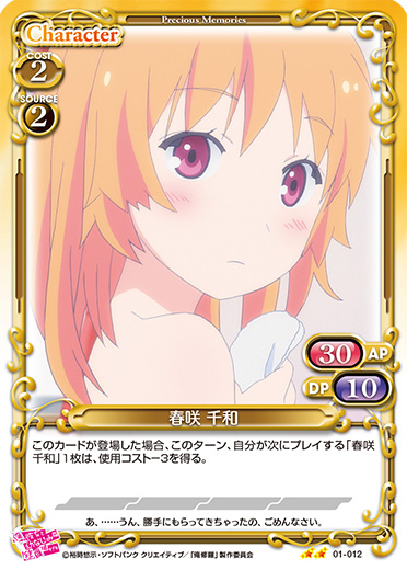 | このカードが登場した場合、このターン、自分が次にプレイする「春咲 千和」1枚は、使用コスト-3を得る。 | ||