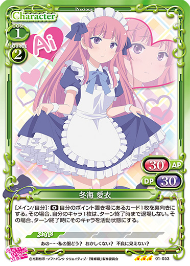 | このカードが登場した場合、自分の捨て札置き場にある『俺の彼女と幼なじみが修羅場すぎる』のキャラ1枚を手札に戻すことができる。 | ||