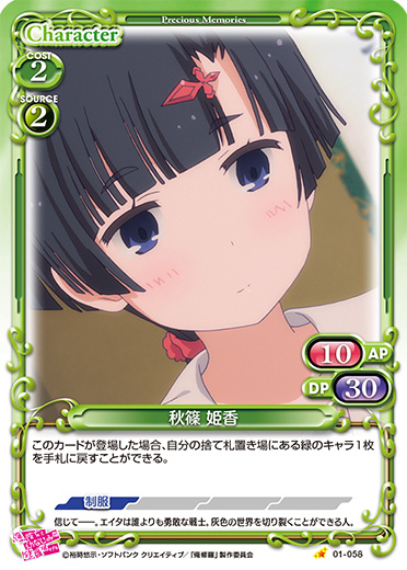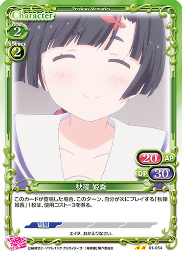 | このカードが登場した場合、このターン、自分が次にプレイする「秋篠 姫香」1枚は、使用コスト-3を得る。 | ||