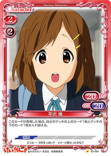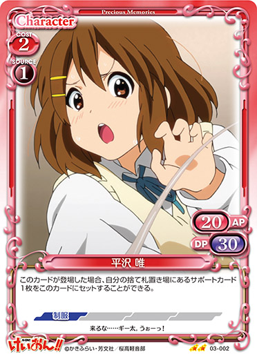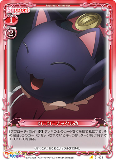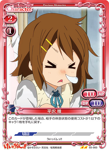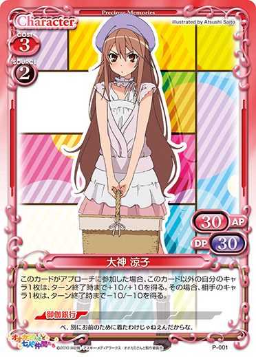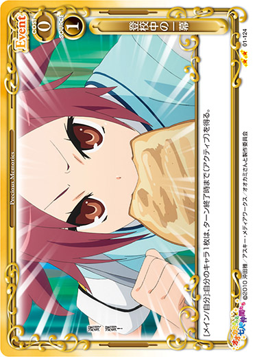 | [アプローチ/自分]:《0》デッキの上のカード2枚を捨て札にする。その場合、このカードがセットされているキャラは、ターン終了時まで+10/+10を得る。 | ||