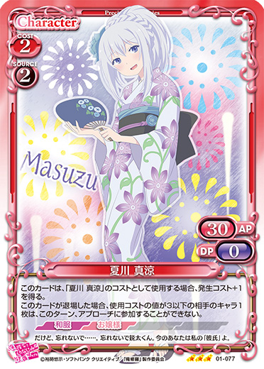 | このカードは、「夏川 真涼」のコストとして使用する場合、発生コスト+1を得る。このカードが退場した場合、使用コストの値が3以下の相手のキャラ1枚は、このターン、アプローチに参加することができない。 | ||