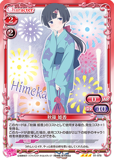 | このカードは、「秋篠 姫香」のコストとして使用する場合、発生コスト+1を得る。このカードが退場した場合、使用コストの値が2以下の相手のキャラ1枚を休息状態にすることができる。 | ||