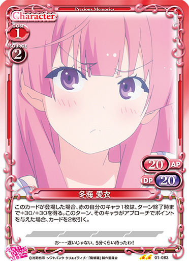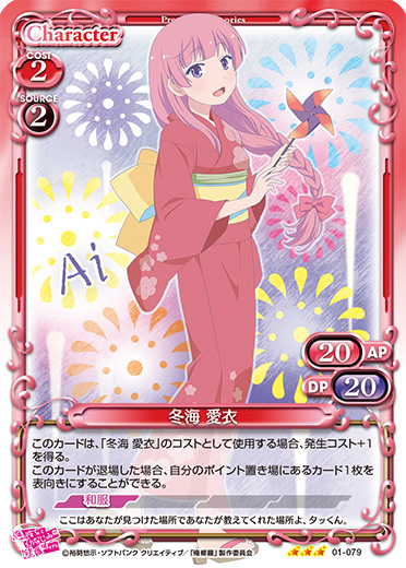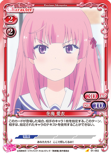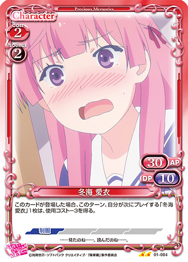 | このカードは、「冬海 愛衣」のコストとして使用する場合、発生コスト+1を得る。このカードが退場した場合、自分のポイント置き場にあるカード1枚を表向きにすることができる。 | ||