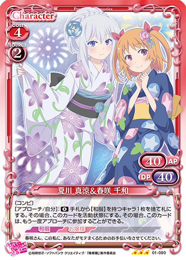 | 〔コンビ〕[アプローチ/自分]:《0》手札から【和服】を持つキャラ1枚を捨て札にする。その場合、このカードを活動状態にする。その場合、このカードは、もう一度アプローチに参加することができる。 | ||