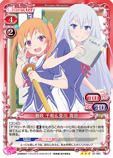 | 〔コンビ〕[アプローチ/両方]:《0》手札からこのカードと同じ名称のキャラ1枚を捨て札にする。その場合、このカードは、ターン終了時まで+20/+20を得る。 | ||