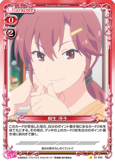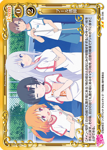 | [メイン/相手]:自分の捨て札置き場にある『俺の彼女と幼なじみが修羅場すぎる』のキャラ1枚を手札に戻す。その後、自分の捨て札置き場にあるキャラ3枚を、任意の順番でデッキの下に移すことができる。 | ||
