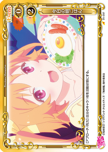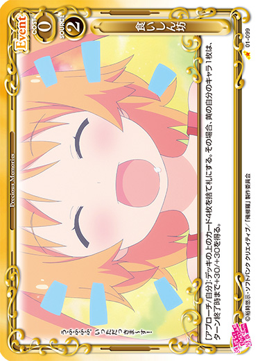 | [アプローチ/自分]:デッキの上のカード4枚を捨て札にする。その場合、黄の自分のキャラ1枚は、ターン終了時まで+30/+30を得る。 | ||