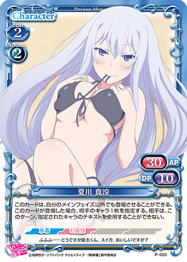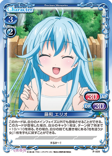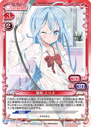 | このカードが登場した場合、デッキの中を全て見て、その中にある『電波女と青春男』のキャラ1枚を抜き出し、サポートエリアに出す。その後、デッキをシャッフルする。その場合、自分の「丹羽 真」1枚の上に青春コインを2個乗せることができる。 | ||