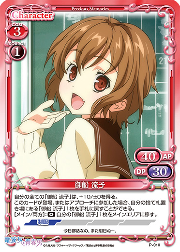 | 自分の全ての「御船 流子」は、+10/±0を得る。 このカードが登場、またはアプローチに参加した場合、自分の捨て札置き場にある「御船 流子」1枚を手札に戻す。 [メイン/両方]:《0》自分の「御船 流子」1枚をメインエリアに移す。 | ||