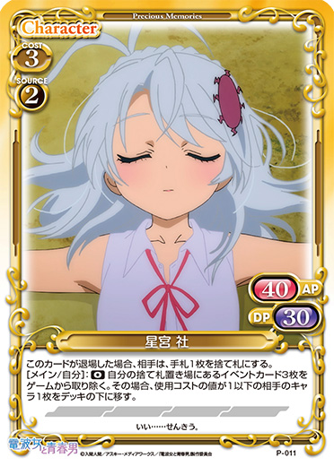 | このカードが退場した場合、相手は、手札1枚を捨て札にする。 [メイン/自分]:《0》自分の捨て札置き場にあるイベントカード3枚をゲームから取り除く。その場合、使用コストの値が1以下の相手のキャラ1枚をデッキの下に移す。 | ||