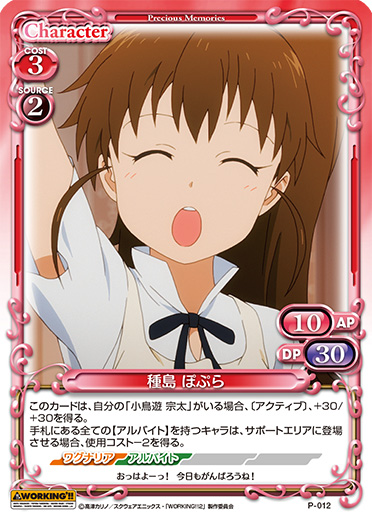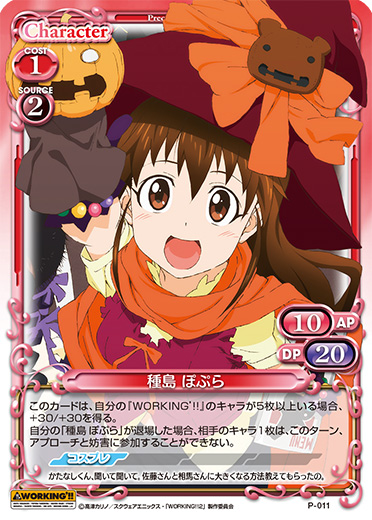| このカードは、自分の『WORKING'!!』を持つキャラが5枚以上いる場合、+30/+30を得る。 自分の「種島 ぽぷら」が退場した場合、相手のキャラ1枚は、アプローチと妨害に参加することができない。 | ||