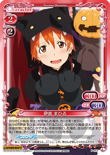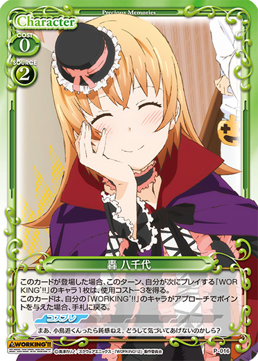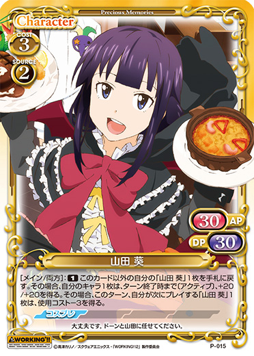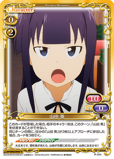 | このカードが登場した場合、このターン、自分が次にプレイする『WORKING'!!』のキャラ1枚は、使用コスト-3を得る。 このカードは、『WORKING'!!』のキャラがアプローチでポイントを与えた場合、手札に戻る。 | ||