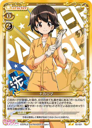 | このカードが登場した場合、自分の捨て札置き場にある『ガールズ&パンツァー』のサポートカード1枚を手札に戻すことができる。[メイン/両方]:《休》サポートカードがセットされている自分のキャラ1枚を活動状態にする。 | ||
