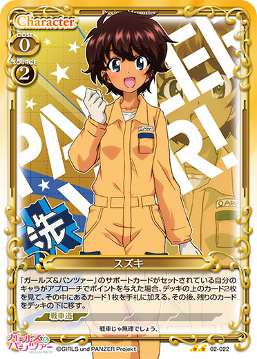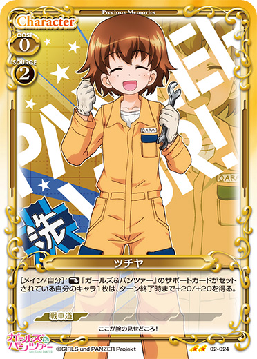| [メイン/自分]:《休》『ガールズ&パンツァー』のサポートカードがセットされている自分のキャラ1枚は、ターン終了時まで+20/+20を得る。 | ||