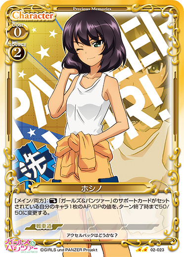 | [メイン/両方]:《休》『ガールズ&パンツァー』のサポートカードがセットされている自分のキャラ1枚のAP/DPの値を、ターン終了時まで50/50に変更する。 | ||