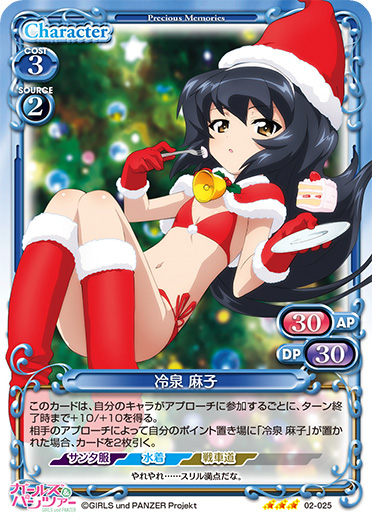 | このカードは、自分のキャラがアプローチに参加するごとに、ターン終了時まで+10/+10を得る。相手のアプローチによって自分のポイント置き場に「冷泉 麻子」が置かれた場合、カードを2枚引く。 | ||
