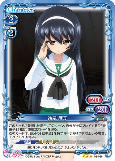 | このカードが登場した場合、このターン、自分が次にプレイする「冷泉 麻子」1枚は、使用コスト-4を得る。このカードは、自分の【戦車道】を持つキャラが10枚以上いる場合、+20/+20を得る。 | ||