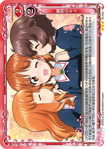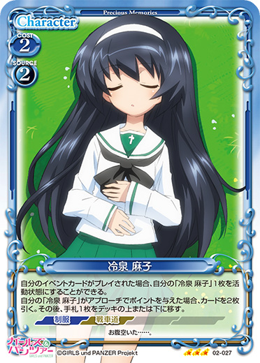 | 自分のイベントカードがプレイされた場合、自分の「冷泉 麻子」1枚を活動状態にすることができる。自分の「冷泉 麻子」がアプローチでポイントを与えた場合、カードを2枚引く。その後、手札1枚をデッキの上または下に移す。 | ||