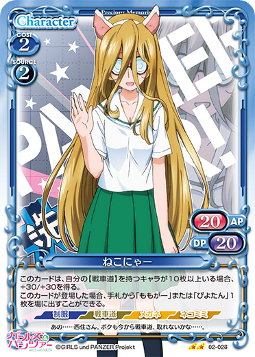 | このカードは、自分の【戦車道】を持つキャラが10枚以上いる場合、+30/+30を得る。このカードが登場した場合、手札から「ねこにゃー」または「ももがー」1枚を場に出すことができる。 | ||