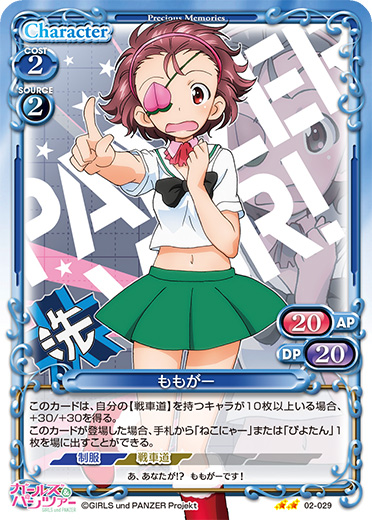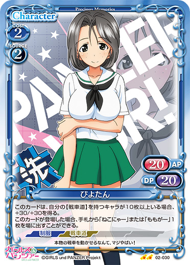 | このカードは、自分の【戦車道】を持つキャラが10枚以上いる場合、+30/+30を得る。このカードが登場した場合、手札から「ももがー」または「ぴよたん」1枚を場に出すことができる。 | ||