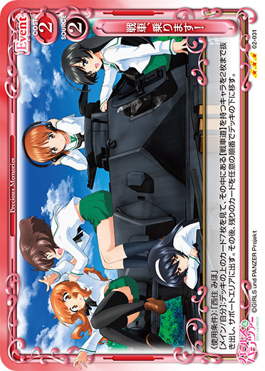 | [アプローチ/自分]:自分の【戦車道】を持つキャラ2枚を休息状態にする。その場合、自分のキャラ1枚は、ターン終了時まで+20/+20を得るとともに、活動状態になる。このターン、そのキャラは、もう一度アプローチに参加することができる。 | ||