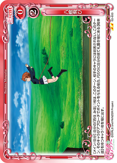 | [メイン/自分]:自分の「西住 みほ」1枚は、このターン、相手のキャラには妨害されない。このターン、そのキャラがアプローチでポイントを与える場合、代わりに自分の捨て札置き場にある【戦車道】を持つキャラ1枚を場に出す。 | ||