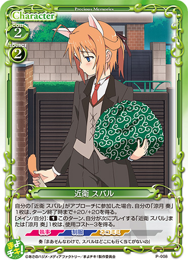 | 自分の「近衛 スバル」がアプローチに参加した場合、自分の「涼月 奏」1枚は、ターン終了時まで+20/+20を得る。 [メイン/自分]:《1》このターン、自分が次にプレイする「近衛 スバル」または「涼月 奏」1枚は、使用コスト-3を得る。 | ||
