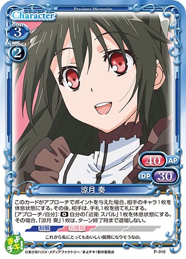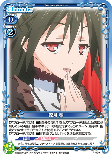 | [アプローチ/両方]:《休》自分の「涼月 奏」がアプローチまたは妨害に参加している場合、相手のキャラ1枚を指定する。このターン、相手は、指定されたキャラのテキストを使用することができない。 [アプローチ/両方]:《休》「近衛 スバル」1枚を活動状態にする。 | ||